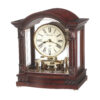 Smaller profile tambour style mantel clock in an Antique Walnut finish on an all wood body with wooden feet. Easy to read Viennese metal dial with a white chapter ring that displays the black Roman numerals. Real glass crystal covers the dial.