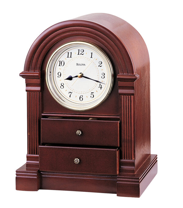 The Bulova Anniston clock with a solid wood and wood veneer case and a walnut finish, this mantel clock is sure to accentuate any home or office space by adding a touch of elegance.