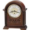 This Majestic desk clock by Bulova is cased in solid maple with a Windsor cherry finish. There are burl pattern veneer accents, angled corners with split columns, hard-carved wood capitals and accents, and Beveled glass in door and side frames decorates the clock. The triple chime German movement plays Westminster, Whittington or St. Michael chimes on the quarter hour and counts the hour. 8-Day Key Wind.