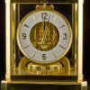 Wood case, antique walnut finish. Decorative carved accents. Brass-finish accents and revolving pendulum. Decorative screened glass front and side panels. Removable clear acrylic back panel. Choice of Westminster, 4/4 Westminster or Bim-Bam chimes. Counts the hour. Adjustable volume control. Three-position chime switch offers choice of silent, night shut-off or lowered volume at night. H: 10.75” W: 9.5” D: 6.5”