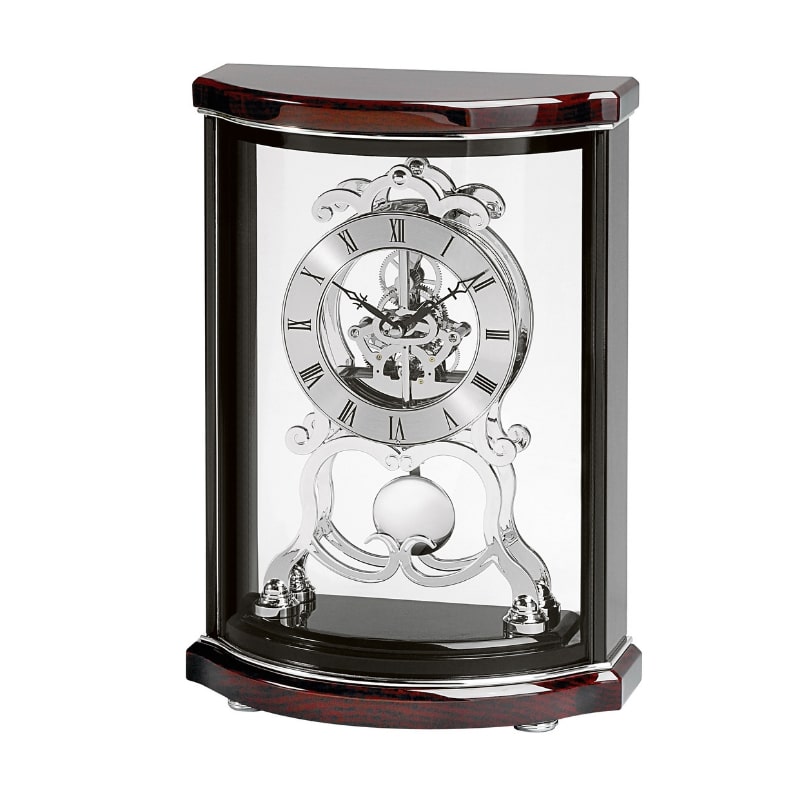 The Non- Chiming Bulova Wentworth offers a solid wood case, high gloss black and mahogany finish and a polished chrome inlaid accent and feet. Chrome-finish metal skeleton gears with swinging pendulum and quartz, non-chiming movement. Protective curved glass lens. 2.5″ x .5″ engraving plate included.
