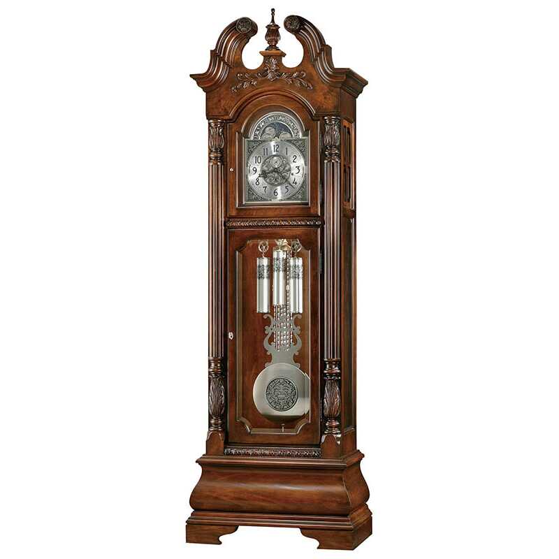 • This handsome floor clock features a distinctively stepped swan neck pediment with book matched olive ash burl, a carved finial, rosettes and a decorative vine and shell overlay.