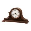 The case features a camphor burl front panel, fluted side column detailing, an off-white dial with black Roman numerals, and brass-tone bun feet.